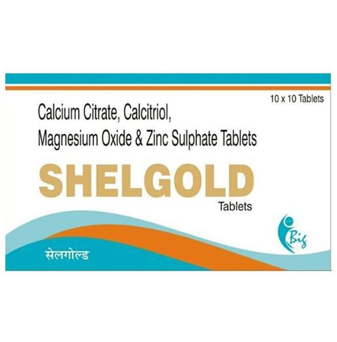 Shelgold Tablet contains Calcitriol (), Calcium Citrate (1000mg), Elemental zinc and magnesium hydroxide as an active ingredient. - Shelgold Tablet is a delicately balanced formula to improve bone and joint health and combating the debilitating bone joint disease. - A perfect combination helping the body in low blood Calcium levels and in body’s normal growth and repair. | Key benefits/ uses of Shelgold Tablets: | - Calcitriol: Form of Vitamin D which ensures better absorption of Calcium. | - Calcium Citrate: Prevents or treats low blood Calcium levels such as bone loss, weak bones, decreased activity of parathyroid gland, and certain muscle disease. | - Magnesium: Required for the maintenance of bones, proper function of nerves, muscles, and many other parts of the body. | - Zinc: Essential for many bodily functions including the immune response, reproduction, growth, and development. | Direction for use/ Dosage: As directed by the physician | Indication: Osteoporosis, Osteomalacia | Storage instructions: - Store in a cool, dry and dark place - Protect from the direct sunlight | | Safety information: - Do not exceed the recommended dose - Read the label carefully before use - Keep out of the reach and sight of children