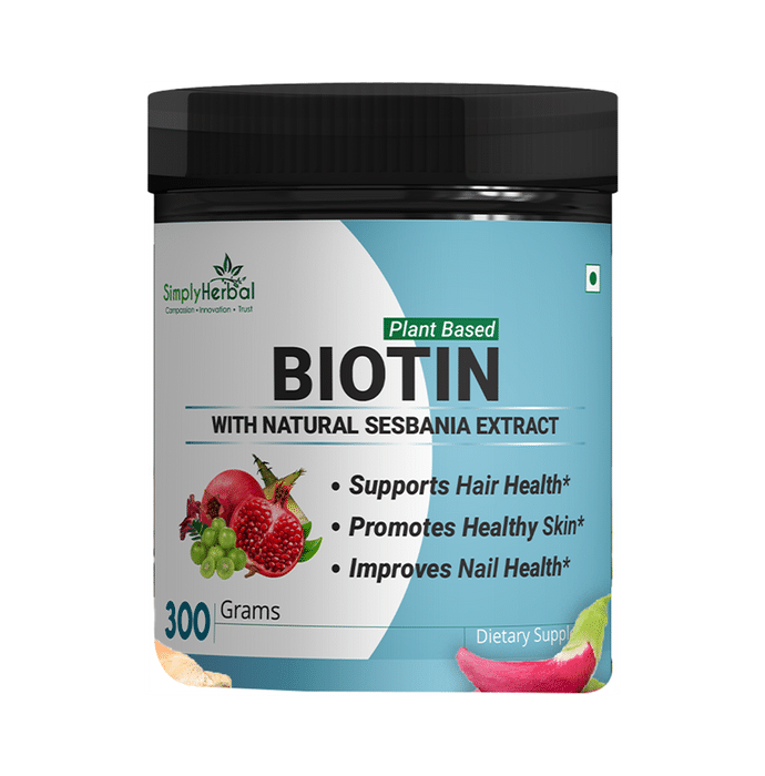 Simply Herbal Plant Based Biotin Biotin is needed for the metabolism of carbohydrates, proteins, and fats to support optimal energy levels. It is also vital for the synthesis of amino acids, which are the building blocks of keratin. Keratin makes up the hair, skin, and nails. Biotin can help improve the body’s keratin infrastructure and strengthen the hair and nails. It may alleviate dry skin, increase hydration, and maintain healthy skin. | Key Ingredients: Sesbania Agati extract Green Mango powder Fennel seeds powder Pomegranate powder Lemon powder Tamarind powder Black salt Bamboo shoot extract Pink salt | Key Benefits: This powder can help support hair volume It may improve scalp health It can boost hair shine It may promote nail health | Directions For Use: Take 100ml of cold water Add 2 heaping scoops of the powder Mix vigorously till uniform | Safety Information: Do not exceed the recommended daily dosage Read the label carefully before use Store in a cool and dry place Keep out of reach of children