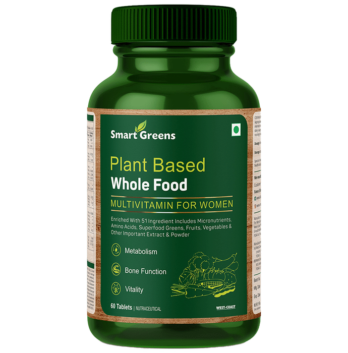 Smart Greens Plant Based Whole Food Multivitamin for Women Tablet Smart Greens Plant Based Whole Food Multivitamin for Women Tablet is enriched with 51 ingredients, including micronutrients, amino acids, superfood greens, fruits, vegetables and other essential extracts which may boosts metabolism, improve bone functioning and promotes women’ s vitality. Get your daily dose of multivitamins with smart greens plant-based wholefood multivitamin for women. The unique multivitamin is fermented with probiotics and formulated to deliver bone support and digestion support for women's needs.