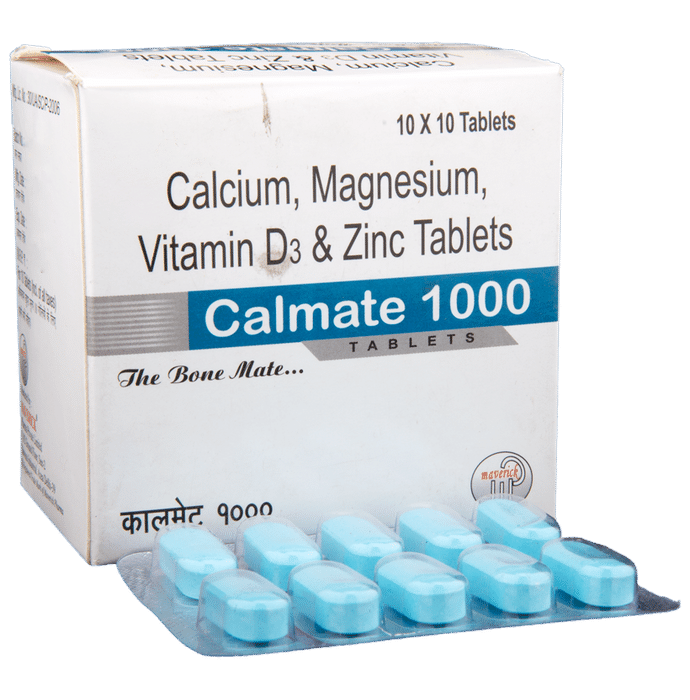 Calmate 1000 Tablet Calmate 1000 Tablet contains Calcium Citrate 1000 mg, Zinc 4 mg, Magnesium 100mg, and Vitamin D3 400 IU. Role of key ingredients: Calcium Citrate provides the body with calcium. Calcium is an essential element required for the development and growth of bones. Zinc is an important trace element essential for maintaining proper health of bones. Magnesium Hydroxide provides the body with magnesium. Magnesium is used to treat low levels of magnesium in the body which leads to osteoporosis and other bone disorders. Vitamin D3 helps the body to absorb calcium and utilize and process it. Calmate 1000 Tablet is used to treat bone problems and post-menopausal osteoporosis. Directions of use: Take Calmate 1000 Tablet once orally. Use under medical supervision.