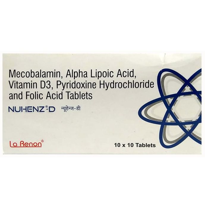 Nuhenz-D Tablet is a dietary supplement that consists of multivitamins and minerals. It helps reduce nerve pain and nerve damage in neuropathy. It works improving blood circulation to peripheral body parts and thus relieving pain. | Key Ingredients: Mecobalamin, Alpha Lipoic acid, Vitamin D3, Pyridoxine Hydrochloride and Folic Acid | Key Benefits: Nuhenz-D improves nerve conduction and speed and thus treats nerve pain in neuropathy Nuhenz-D helps reduce inflammation in the body and protects against various other diseases Nuhenz-D tablet helps improve certain conditions of the brain and nervous system | Effects of Deficiency: Lack of Mecobalamin, Alpha Lipoic acid, Vitamin D3, Pyridoxine Hydrochloride and Folic Acid can cause: Muscle weakness Neuropathic pain | Product Form: Tablet | Directions For Use: Use as directed by your healthcare professional. | Safety Information: Read the label carefully before use Store at a temperature below 25 degrees celsius Do not exceed the recommended dosage Keep it away from the reach of children
