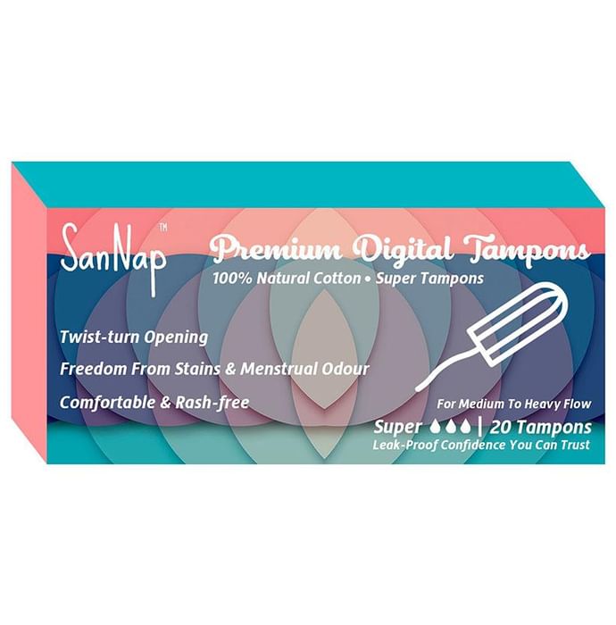 Sannap Premium Digital Tampons gives freedom from leakage, wetness, and discomfort. Soft Tampons comes with an applicator which allows an easy application of usage. | Uses: It is primarily used during menstruation instead of sanitary pads | Product Specifications and Features: Gives freedom from leakage, wetness, and discomfort These tampons are made for regular menstrual flow Finger size absorbent core which has the capacity to absorb up to 8 hours | Directions For Use: Use as directed on the label. | Safety Information: Read the label carefully before use Store in a cool dry place away from direct sunlight Keep out of reach of the children